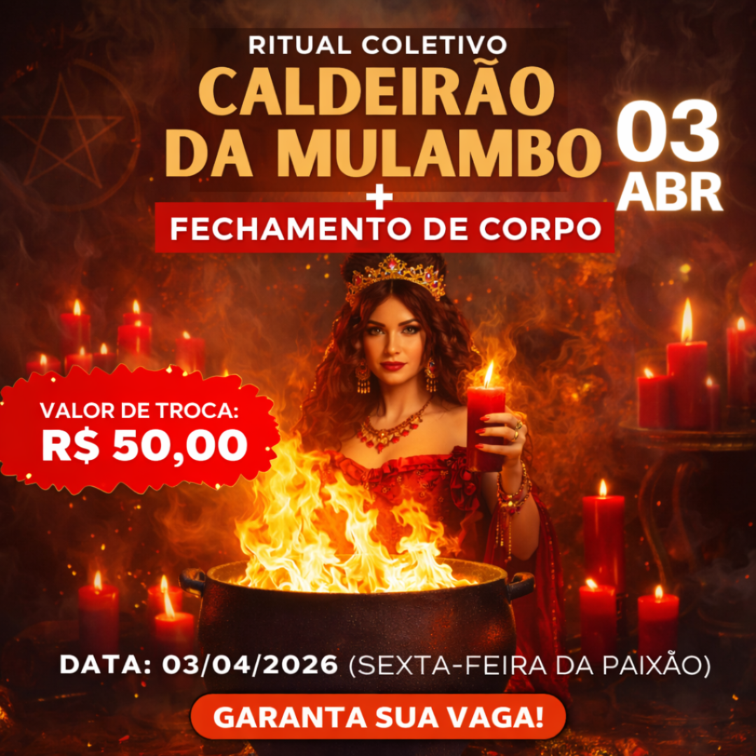 No dia 03 de abril, na poderosa Sexta-feira da Paixão, a força de Maria Mulambo se manifesta através do seu caldeirão espiritual para realizar um trabalho profundo de proteção, limpeza e fechamento de corpo.